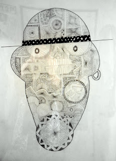 Le beau masque de Bilal, 10 ans, réalisé sur une grande feuille (50X65 cm). Le graphisme est vraiment très raffiné. A quand un autre, Bilal? J'attends avec impatience!